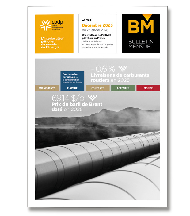 22 janvier 2026Bulletin MensuelSynthèse de l'activité pétrolière (pétrole brut et produits pétroliers raffinés) en France, de l'amont à l'aval (production, importations, exportations, raffinage, livraisons, consommation), et ... -