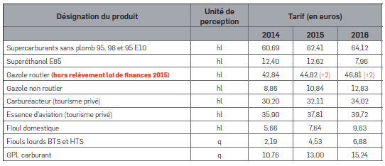 Le I de l’article 36 de la loi de finances pour 2015 prévoit une hausse de 2 c€/l de TICPE applicable au carburant gazole, qui porte le taux à 46,82 € en 2015 et 48,81 € en 2016. Ce relèvement s’ajoute à la hausse liée à la fraction de la taxe correspondant au contenu en dioxyde de carbone du gazole à usage carburant instaurée par la contribution climat énergie (voir tableau ci-après).