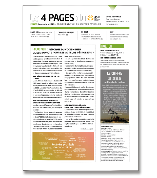 26 septembre 2025Le 4 pagesLettre d'information dédiée à la réglementation du secteur pétrolier en vigueur et en cours de rédaction. -