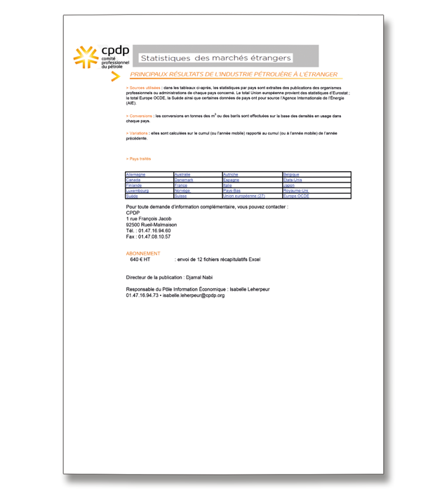 Les tableaux de données indiquent mensuellement les principaux résultats de l'industrie pétrolière à l'étranger. Y sont détaillés : la production, les flux du commerce extérieur, le raffinage et la consommation intérieure des produits pétroliers.