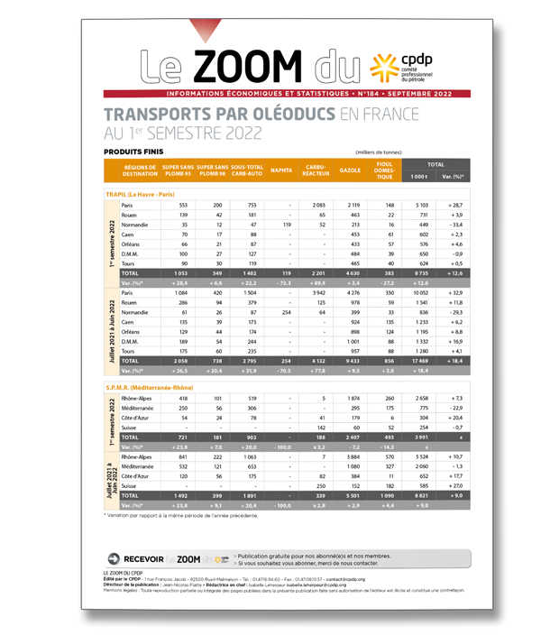 Les tableaux de données indiquent mensuellement les principaux résultats de l'industrie pétrolière à l'étranger. Y sont détaillés : la production, les flux du commerce extérieur, le raffinage et la consommation intérieure des produits pétroliers.